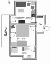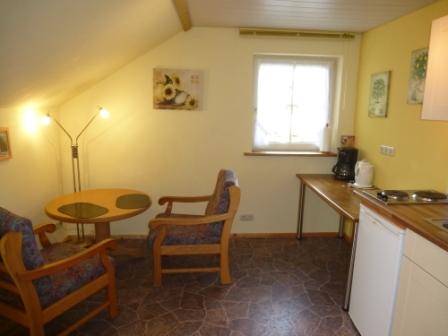 Kühlschrank. Küchenausstattung: 2-Platten-Kochstelle, komplettes Ess- und